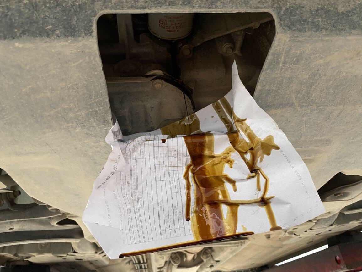 看看這機油多臟,按時保養還是很重要的,用扳手上緊油底殼螺絲。