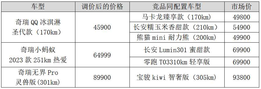 2023年3月27日0點起,奇瑞新能源旗下奇瑞QQ冰淇淋、奇瑞小螞蟻和奇瑞無界Pro三款產品官方指導價正式回調,至高回調幅度9000元。當汽車行業最殘酷的價格戰打響,限時降價、保價等奇招盡出時,奇瑞新能源將格局直接拉滿,成為純電小車首家官降。